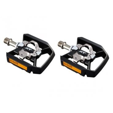 Педали Shimano XT T8000 считают в себе сразу 2 вида педалей. С одной стороны они стабильные, платформенные педали с шипами, а с другой это высокоскоростные педали с креплением для велообуви. За счёт своей универсальности они отлично будут смотреться как на маунтин байке так и на шоссейнике.